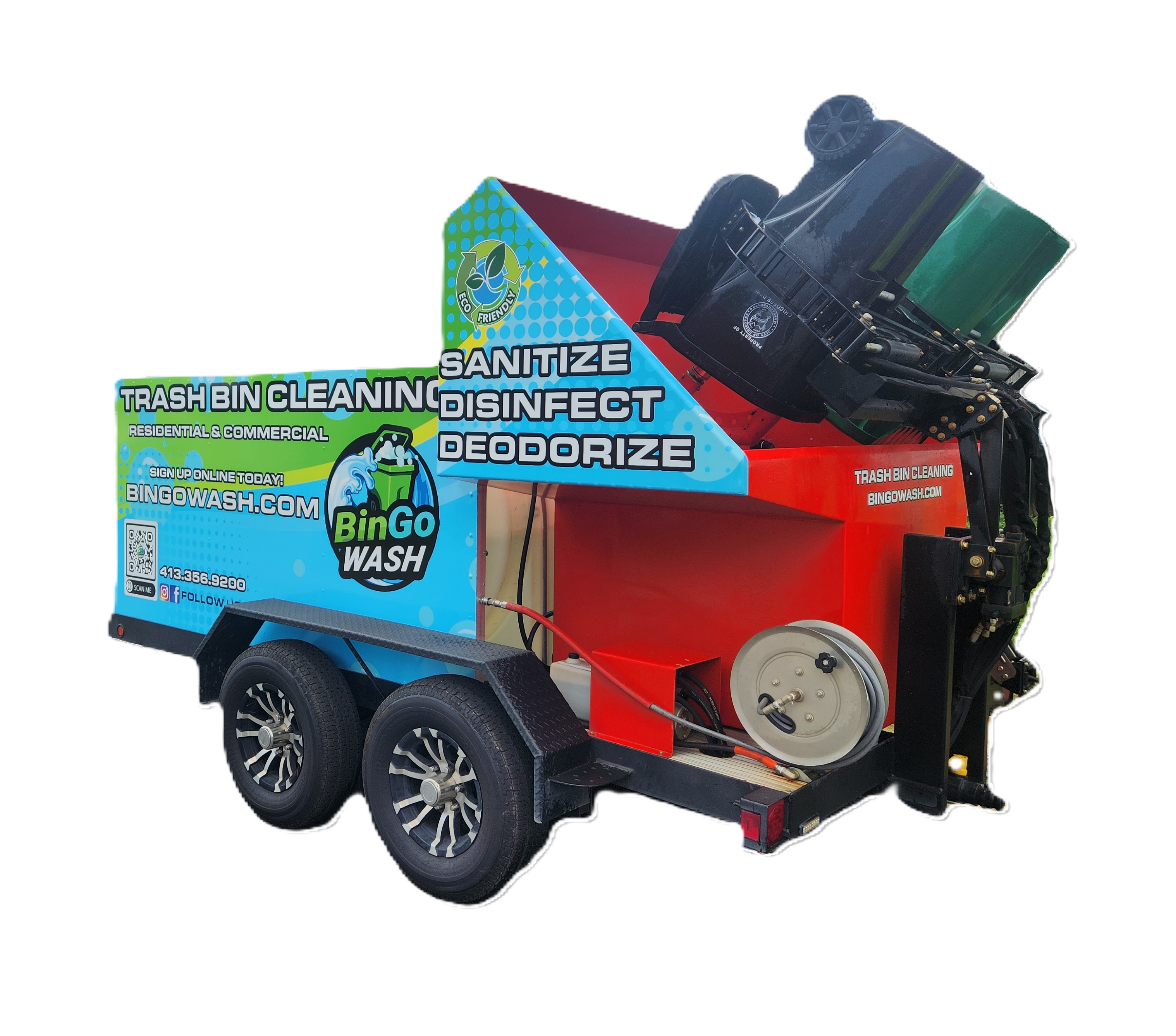 BinGo provides professional trash bin cleaning that cleans, sanitizes, and deodorizes your residential bins using state-of-the-art, eco-friendly trucks. Our high-powered system uses 200-degree hot water and 3,500 PSI pressure to eliminate 99.9% of germs and bacteria—leaving your bins curbside, fresh, and sparkling clean.
